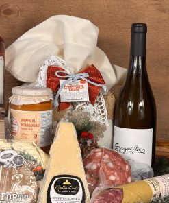 Un’elegante scatola regalo che racchiude sapori dolci e salati, pensata per offrire un’esperienza gastronomica toscana completa: dall’antipasto al dolce, con il vino giusto per ogni momento.